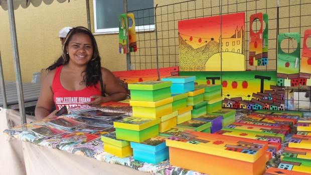 “Os primeiros souvenirs [que vendemos aos turistas] foram as garrafas de vidro, mas eu também comecei a fazer umas caixas de madeira. Aí eu percebi que decoupage dava muito trabalho e decidi tentar pintar as imagens. Eu fiz uma, duas, três… Daqui a pouco o Cléber estava vendendo todas”, explica Mariluce.