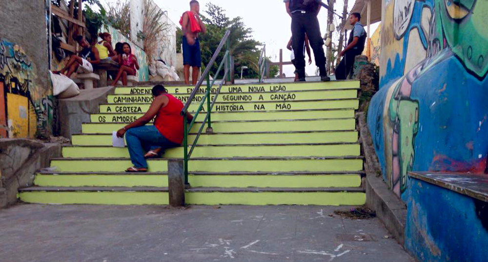 Com tintas coloridas e com a ajuda do Favela Painting, jovens moradores escreveram letras de música na escadaria para divulgar os seus pedidos pelas melhorias necessárias no saneamento básico e na coleta de lixo. Continuando até o início da noite, o projeto foi visto por muitos moradores que passaram para cima e para baixo pelas escadas, além da presença dos soldados da Unidade de Polícia Pacificadora (UPP), que estavam ali armados, na parte superior e inferior da escada.