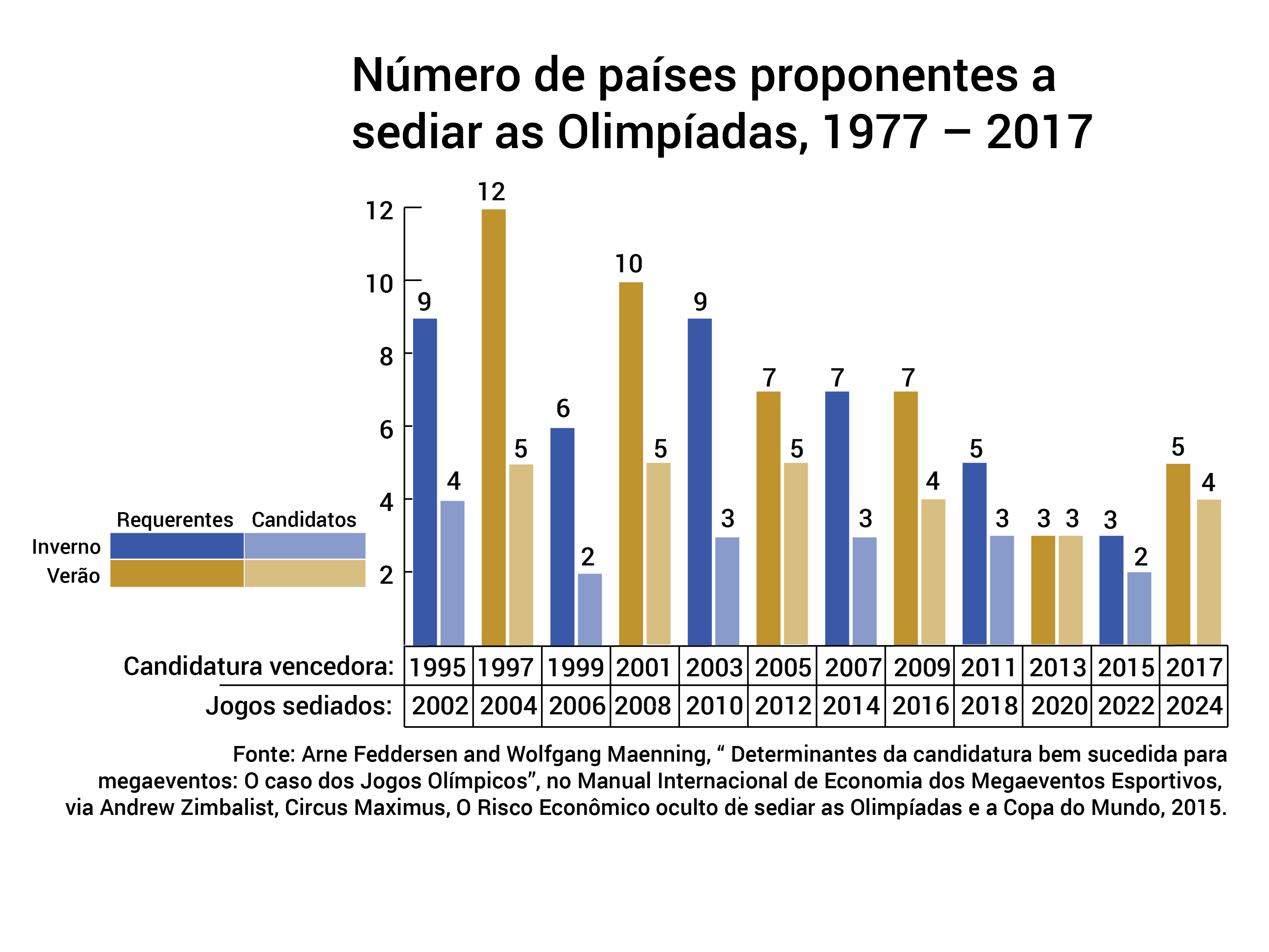 Aqui nós vemos o declínio geral do interesse em sediar os Jogos Olímpicos ao longo das últimas duas décadas. Note que esse gráfico não inclui requerentes que cancelaram sua candidatura antes que os candidatos fossem escolhidos, nem candidatos que desistiram antes que a oferta fosse concedida.