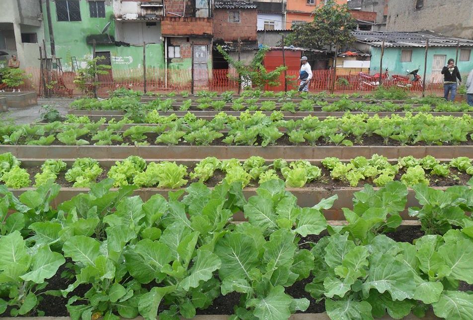 Em Manguinhos, na Zona Norte da cidade do Rio de Janeiro foi realizada uma grande obra de infraestrutura pública destinada a abertura de ruas, coleta de lixo, serviço de água e esgoto. Neste processo foi removida uma camada de terra contaminada que era preenchida com saibro, brita e pó de pedra, usados para evitar mato e lama. Ao remover o material, foi levado a terra, composto e mudas, e um sistema de água e de drenagem foi montado. O local hoje abriga a maior horta urbana comunitária da América Latina. O ambiente é ocupado por mais de 300 canteiros, com 160 em produção. Contam com a mão de obra de 27 novos hortelãos. Todos aprenderam o ofício durante o projeto, ninguém era do ramo.