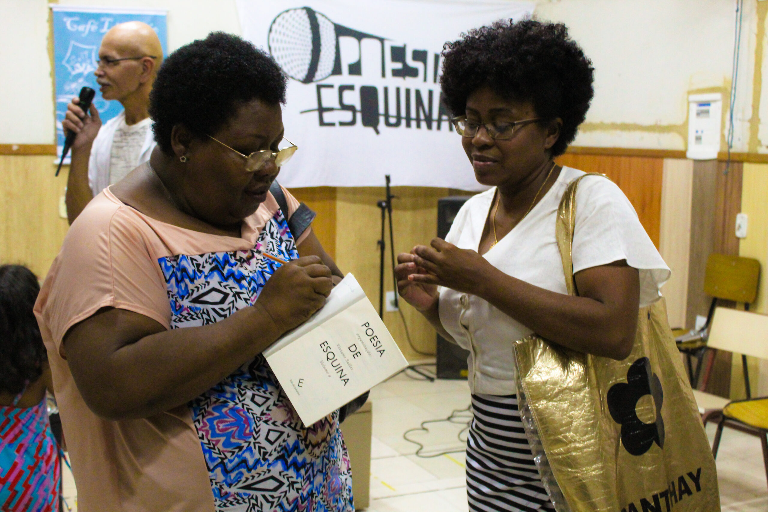A programação do lançamento, organizada em quatro momentos, iniciou em roda de conversa. O papo girou em torno de uma reflexão propositiva: “Como estimular a leitura e a escrita da poesia nas periferias?”. Com mediação do poeta e co-fundador do movimento Poesia de Esquina Wellington França, os escritores Letícia Brito, do Slam das Minas, Jessé Andarilho, que toca o projeto Marginow, Yolanda Soares e Anderson Quack, cineasta e ativista social da Cidade de Deus e cofundador da CUFA (Central Única das Favelas), abriram a noite, compartilhando trajetórias e pensando com o público presente a importância dos movimentos e coletivos populares e comunitários para o desenvolvimento social dos territórios à margem dos direitos mínimos, humanos.