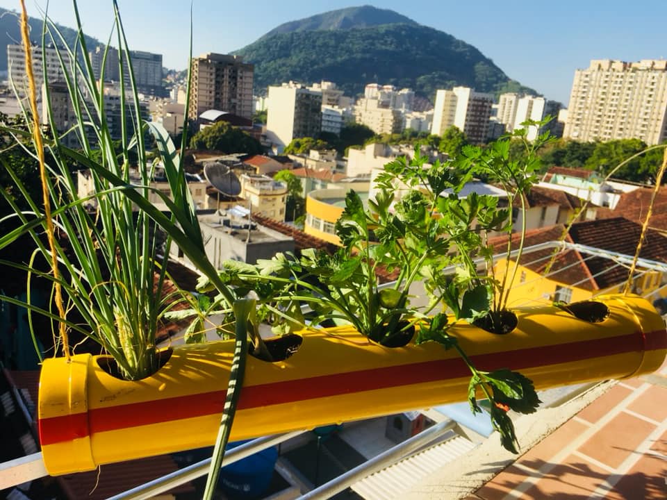 José Elias—que recentemente foi destaque na revista francesa de agricultura urbana De Ville En Ville—criou um sistema simples de irrigação mecanizada movido a energia solar que tem o potencial de revolucionar completamente hortas urbanas e a agricultura não apenas no Santa Marta, mas também em outras comunidades do Rio e além. Seu sistema começa com um pequeno painel solar, de aproximadamente 40×40 centímetros. O painel aciona uma válvula solenoide que, controlada por sensores da umidade no solo, libera uma quantidade específica de água da chuva armazenada na horta por meio de uma mangueira porosa. Enquanto a horta puder ser mantida a salvo de criaturas famintas, ele prosperará com pouquíssima manutenção ou custos adicionais. “Eu acho que é legal!” José Elias afirma com orgulho. “Com esse sistema, não precisamos de muitos recursos para uma horta funcionar”.
