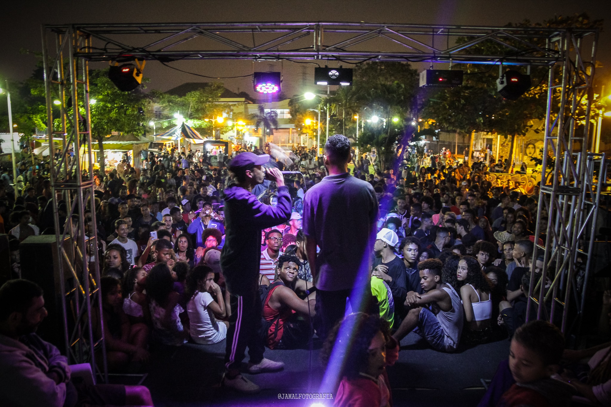 “O Pac’Stão vai estar em festa!”, dizia uma postagem do Instagram anunciando o aniversário de dois anos da roda, no dia 15 de julho. Apesar de segunda-feira, as férias escolares ajudavam a explicar a rua cheia de gente e o intenso vai e vem de motos. Feito todo o corre da montagem do palco e dos equipamentos, eram quase 22 horas quando a batalha começou, porque “o som ficou preso lá no Manguinhos”, como esclareceu Xandy.