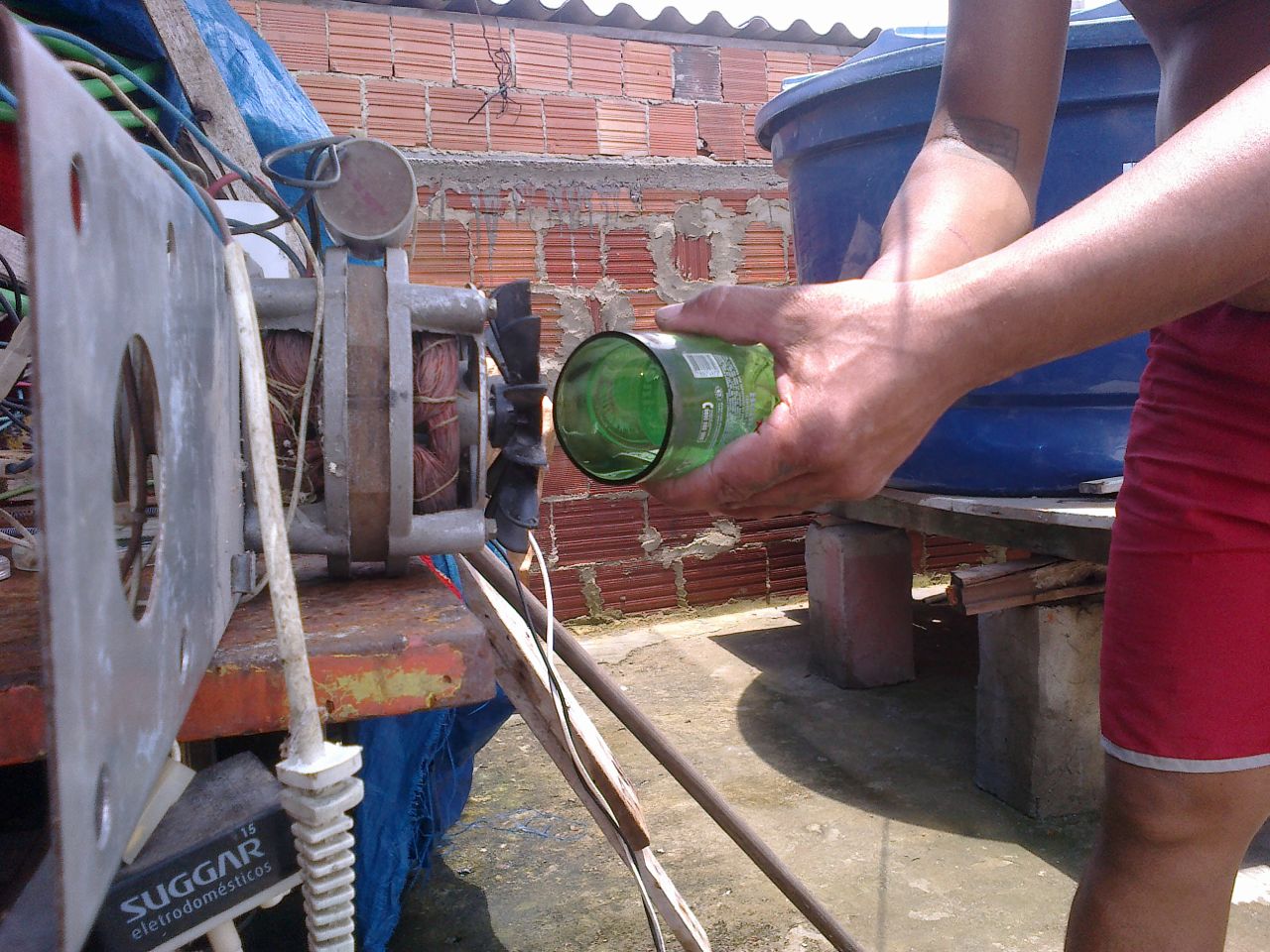Alex se refere a pouca estrutura que tem. Tudo é realmente artesanal. Para realizar o corte das garrafas ele utiliza uma resistência de chuveiro acoplada a um pedaço de madeira ligada à energia, um estalo e pronto a peça já ganha forma. Outra curiosidade é a lixadeira criada por ele, simplesmente um motor extraído de um tanquinho de lavar roupas que carrega a responsabilidade de retirar o perigo de haver um corte ao levar as taças à boca. Seu público-alvo encontra-se em todos os lugares. Alex vende para bares, clientes dos bares, moradores. Mas é no baile funk que ele realmente ganha o dia, ou melhor, a noite. “No baile todos me conhecem e compram mesmo, principalmente porque vendo barato e eles tem aquela vontade de beber num copo exclusivo”. Os preços são os mais variados, vão de R$2 até R$20, depende muito do tamanho, do trabalho que dá e também da dificuldade em encontrar determinada garrafa.