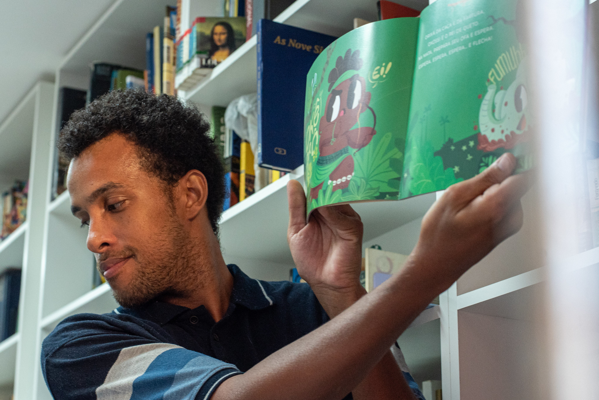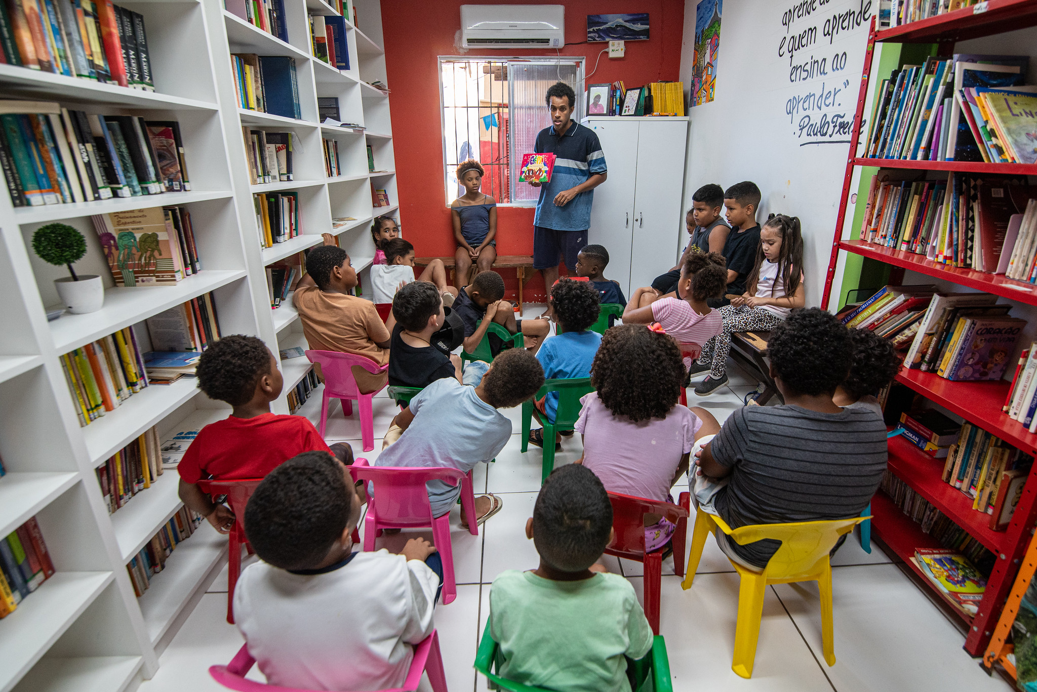 “[Em] toda parte da biblioteca, eu sou responsável pelo livro e leitura com as crianças. Então, aqui, eu faço parte da mediação de leitura. Eu tenho a prática de toda semana fazer esse trabalho de livro e leitura, de incentivar a leitura, de [incentivar] pegar no livro. Porque, assim, a grande maioria das nossas crianças, elas vêm com déficit muito grande na escola. E a gente não tem a estrutura necessária para trabalhar a alfabetização com as crianças. Mas a gente entende que passando o incentivo da leitura, por mais que eles não saibam ler, eles gostam de história, eles gostam de entender história, de ler e de ver. Tem criança que ainda está no processo de alfabetização, ou ainda na creche, que quer ler, quer ver as imagens. Então, a gente faz esse trabalho de fomento à leitura.” — Jeferson Dias