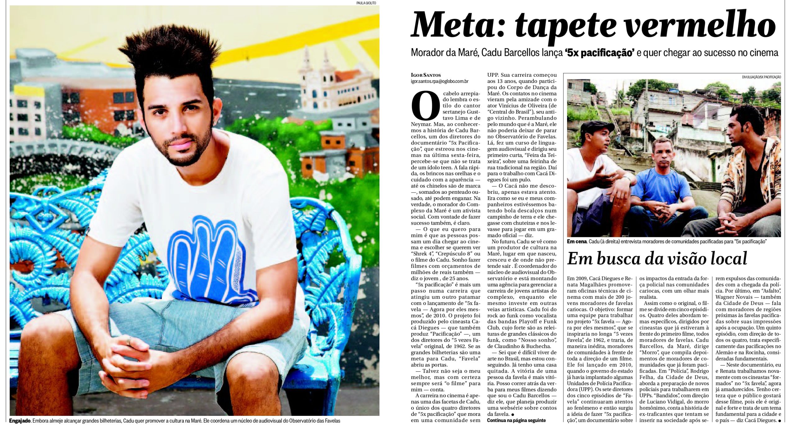 Aos 25 anos de idade, sua identidade artística, agora consolidada no cinema, já chamava a atenção da grande imprensa. Em uma matéria publicada em O Globo sobre o lançamento de 5x Pacificação, do qual Cadu era roteirista, ele foi descrito como um ativista social, cuja ambição definia o tamanho de seu sonho: “O que eu quero para mim é que as pessoas possam um dia chegar ao cinema e escolher se querem ver Shrek, Crepúsculo 8 ou o filme do Cadu,” afirmou o cineasta à entrevista daquela matéria. Com o sucesso de projetos como 5x Favela, Agora por Nós Mesmos, apadrinhado por Cacá Diegues, Cadu provava que o jovem da Maré não apenas contava histórias, mas estava pronto para disputar as maiores bilheterias.
