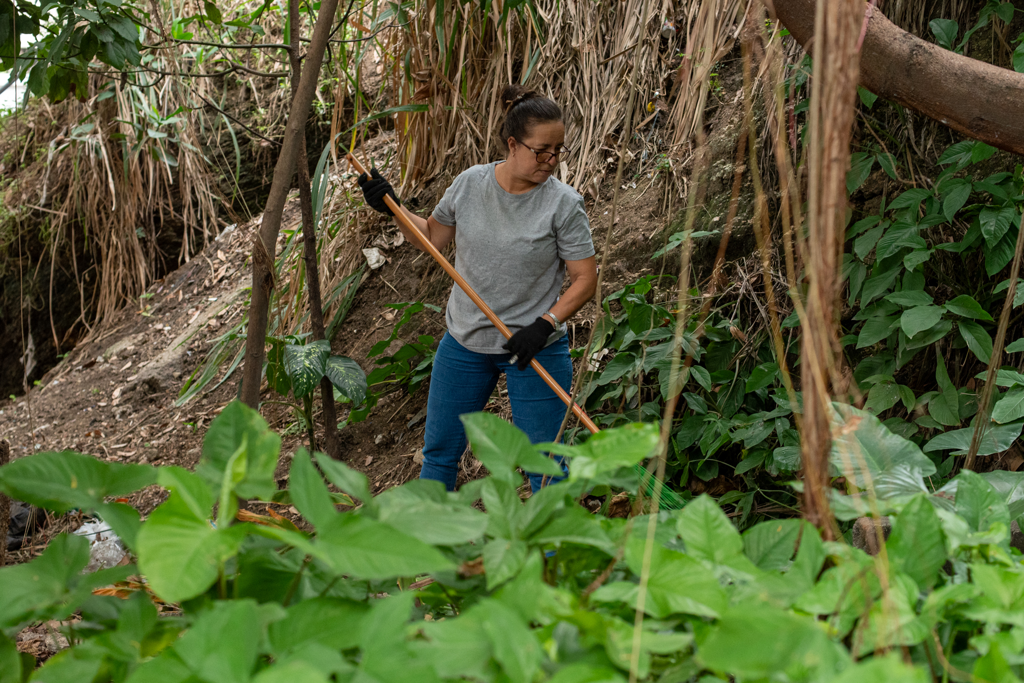 “Eu moro há 40 anos aqui nessa área… A gente tinha que vir mais vezes [para manter limpo], mas a vida é muito corrida, né? Tinha que ter mais plaquinhas para educar os moradores, para manter o ambiente limpo. As vezes que a gente vem, a gente faz a diferença. Tem que ser isso, cada um fazer um pouco. Quando viu, esse pouco virou muito. Eu sou aluna de costura da Alessandra, eu faço parte [do curso de] corte e costura, de costura criativa. Aí, ela fala que [vai ter o mutirão] e a gente vem ajudar com a força.” — Franklina do Nascimento