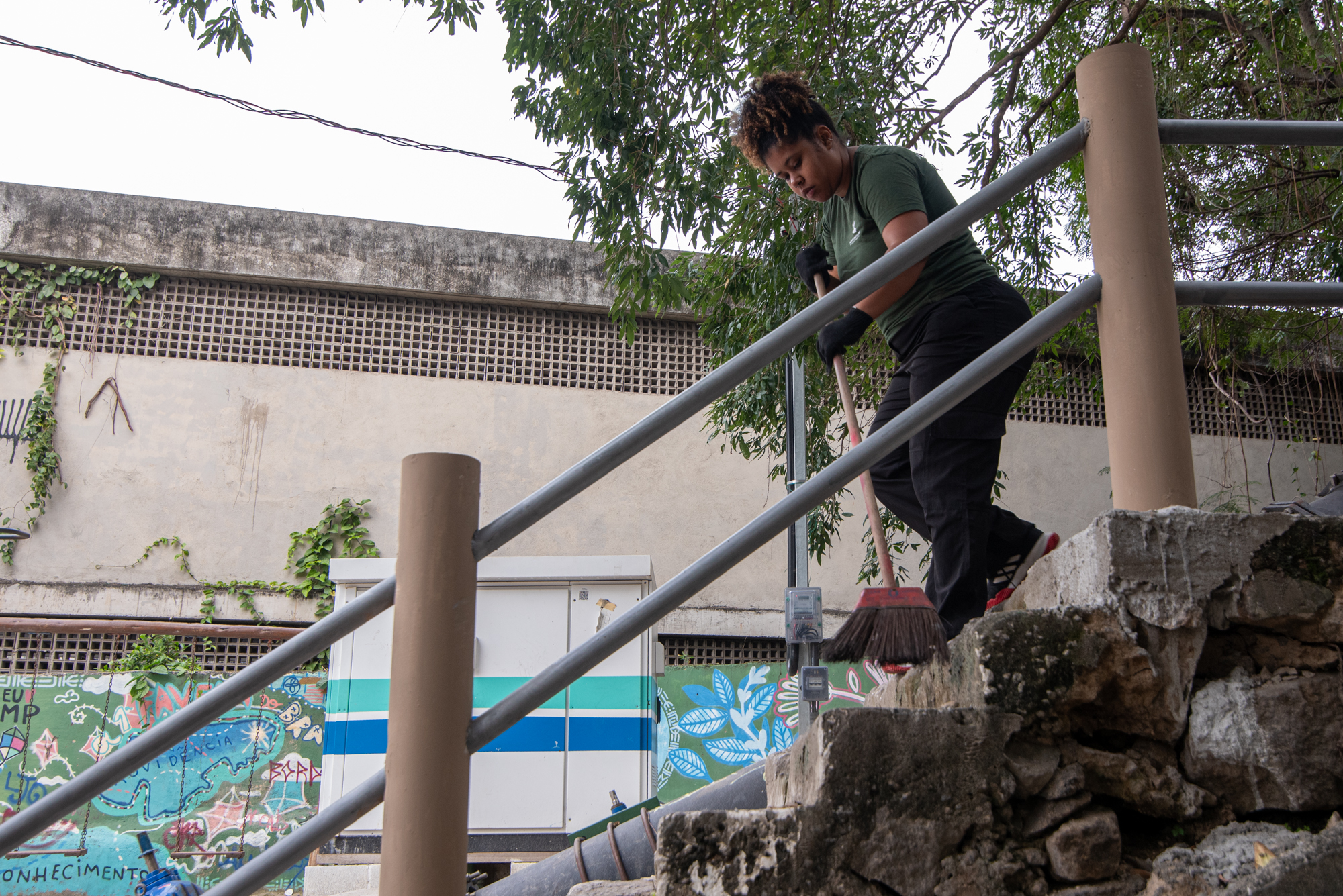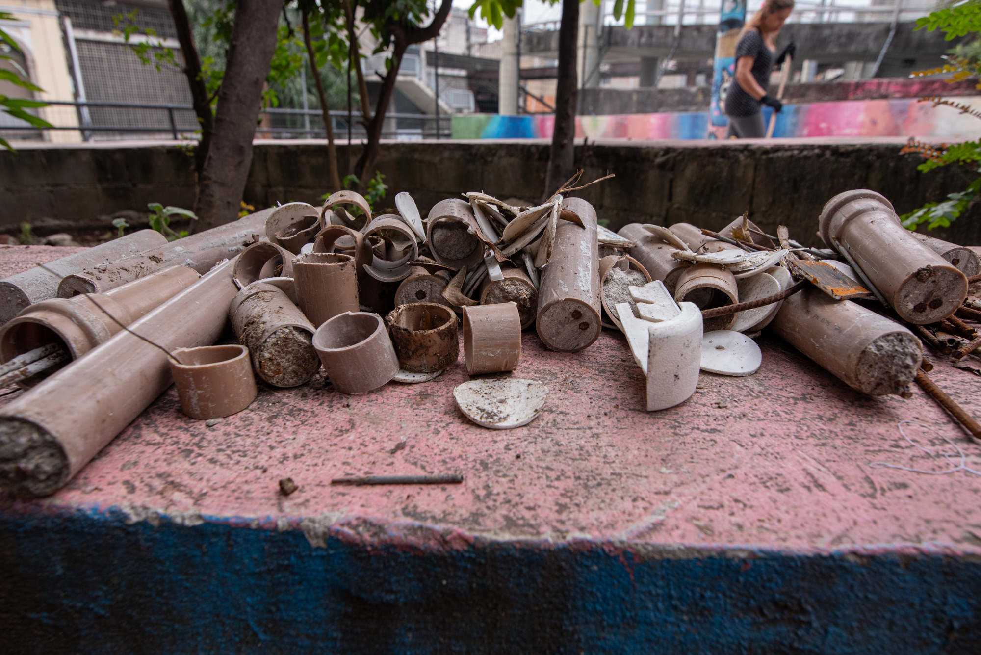 “Além do processo que a gente enfrenta com [alguns] moradores que jogam entulho, há pessoas em situação de rua que, às vezes, procuram um abrigo e deixam seus lixos ali. A gente encara também o descaso do poder público, que foi ali fazer o corrimão da escada e jogou todo o cimento… dentro do canteiro. Todos os restos de entulho, cano, vergalhão, tudo foi jogado dentro do canteiro.” — Alessandra Roque