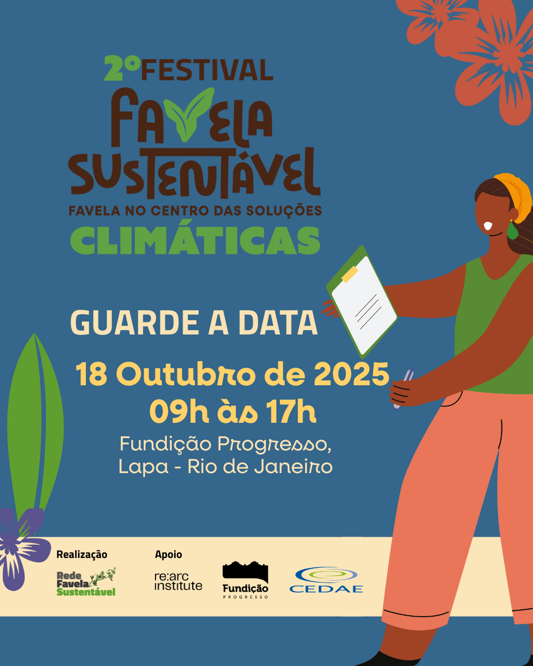 O 2º Festival Favela Sustentável: Favela no Centro das Soluções Climáticas é realizado pela Rede Favela Sustentável com o apoio do re:arc institute e a parceria da Fundição Progresso e CEDAE. O evento de 2025 também está fazendo parte de três outras agendas essenciais pré-COP na cidade do Rio de Janeiro: a Virada Sustentável RJ, a 15a Semana de Agricultura Carioca e o Outubro Urbano da ONU Habitat.