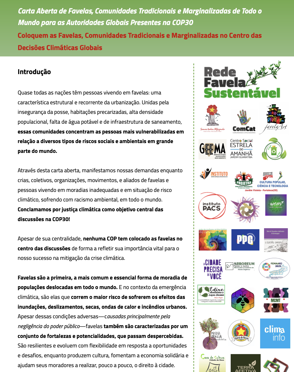 Ao longo do primeiro semestre de 2025, mais de 100 integrantes e aliados da Rede Favela Sustentável construíram a “Carta COP30 das Favelas“, uma carta-manifesto, denominada ‘Carta Aberta de Favelas, Comunidades Tradicionais e Marginalizadas de Todo o Mundo para as Autoridades Globais Presentes na COP30’ e com o subtítulo com declaração de intenção: “Coloquem as Favelas, Comunidades Tradicionais e Marginalizadas no Centro das Decisões Climáticas Globais”.