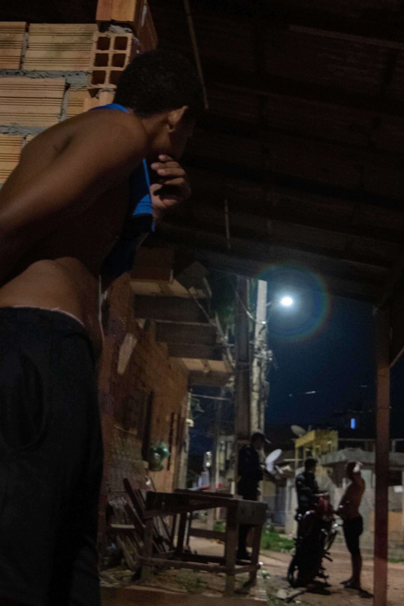 Passado um tempo, os policiais entraram na viatura, deram ré e pararam em frente ao ponto de distribuição de quentinhas. Os policiais encararam lenta e profundamente cada um dos presentes, em tom ameaçador. Mas decidiram não sair do carro. Manobraram e, logo em seguida, atravessaram a ponte sobre o córrego e se dirigiram à outra área da comunidade.