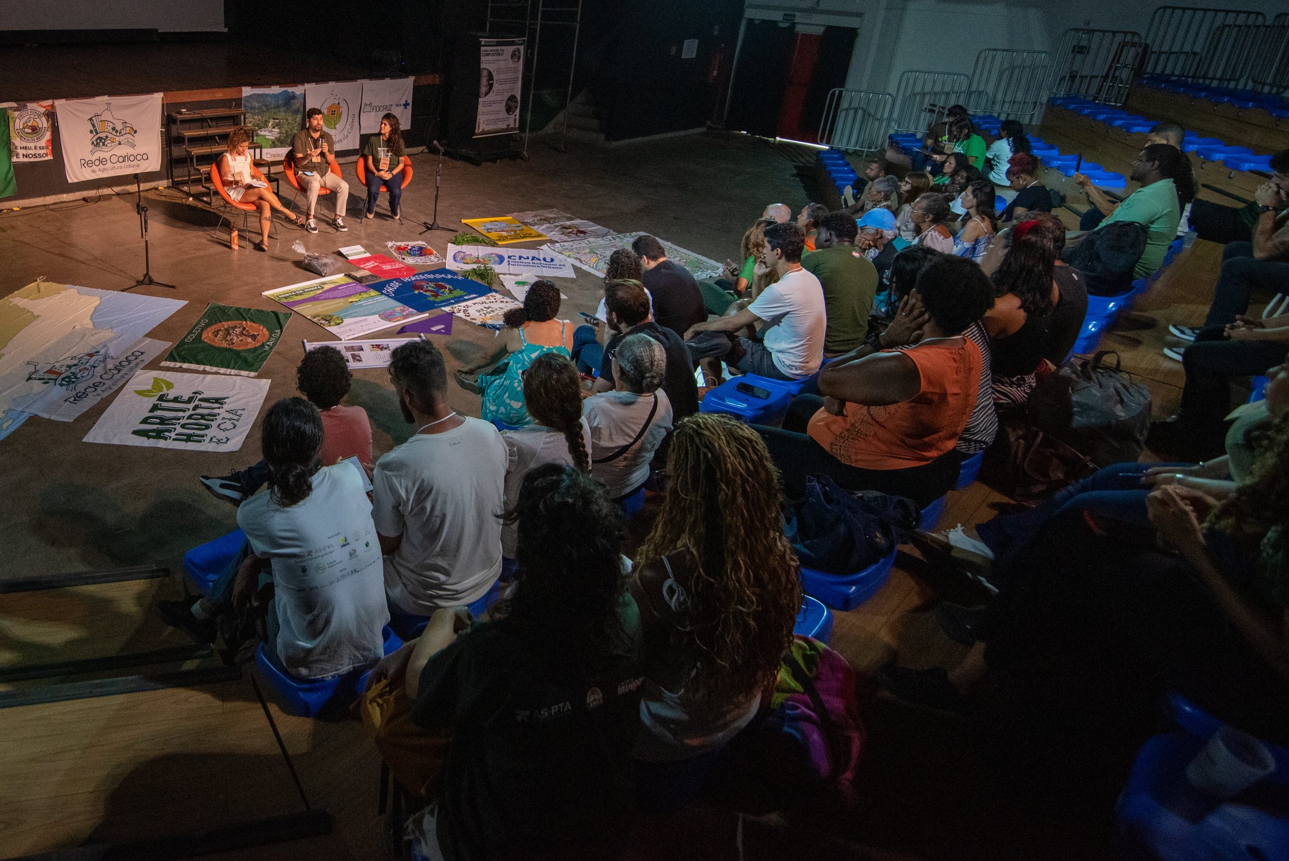 “A Penha está recebendo de forma inédita essa grande exposição. A exposição fez parte do conteúdo metodológico da escola, que vinha trabalhando a questão do rio, do valão, as questões climáticas, as questões do Parque Ary Barroso. Então, nada mais justo do que trazer essa exposição para dentro da escola, com os jovens, com os adolescentes, com as famílias, para que a gente não só pulse na Penha, mas que também valorize as juventudes que estão aí construindo um território de bem-viver. Hoje, a gente está na Arena Carioca Dicró, que foi o palco que recebeu a nossa Roda de Memória Climática. A arena está dentro do Parque Ary Barroso, que é uma unidade de conservação. E por que não pensar essa exposição junto ao Encontro de Composteiros, que acontece anualmente, e ao Encontro Anual do Plano Integrado de Saúde nas Favelas? Então, hoje, num dia só, a gente conseguiu unir grupos de diferentes favelas que trabalham as questões ambientais a partir da compostagem. A gente sabe que o resíduo, o que muita gente chama de lixo, é um dos grandes problemas, que foi trazido muito, inclusive, na nossa Roda de Memória Climática da Penha. Mas, hoje, a gente só falou de soluções, soluções climáticas na favela. Eu, que participo da Rede Favela Sustentável desde o início me sinto muito contemplada com o debate e, sobretudo, com todo esse visual que não traz só a Penha como eixo central, mas que traz todas as outras favelas. No dia 10 de dezembro, Dia dos Direitos Humanos, essa exposição vai estar na rua, na Vila Cruzeiro. Tanto como uma questão de reparação, depois de toda essa chacina que aconteceu, porque o que a gente quer ver, no meio da Vila Cruzeiro, não são corpos retirados no chão. A gente quer ver as nossas memórias, as nossas histórias, o reconhecimento do povo que, desde sempre, vem criando soluções para viver melhor e para construir bem-viver em rede.” — Ana Santos