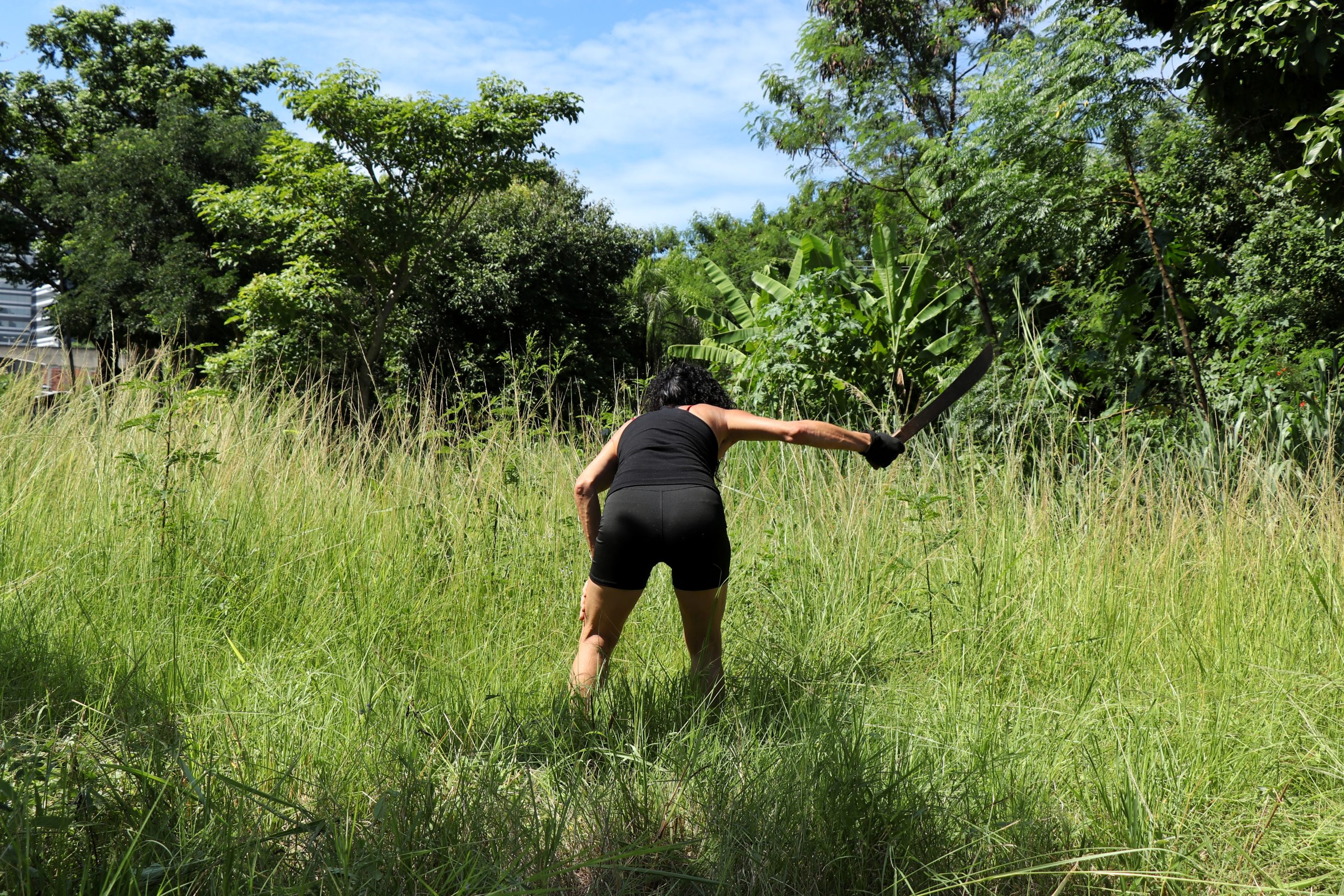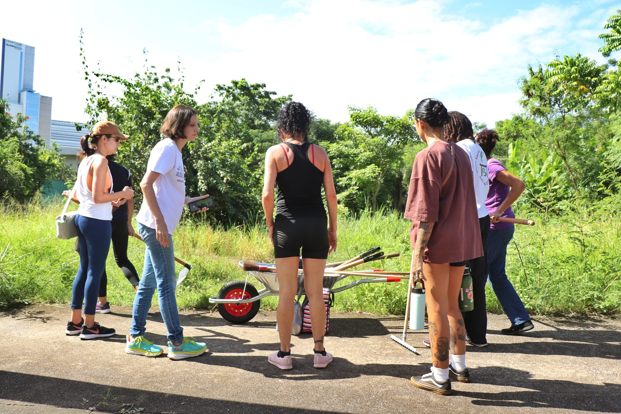 Nathalia Macena, moradora cria da Vila Autódromo, conduziu o grupo composto em sua maioria por mulheres. A distribuição de ferramentas, o alinhamento das tarefas e o deslocamento até a área que precisava de intervenção aconteceram às 9h, dando-se início ao trabalho. Em meio a muito capim e plantas invasoras, o esforço coletivo, o suor nos rostos e os sorrisos tornaram evidente o sentimento de realização.
