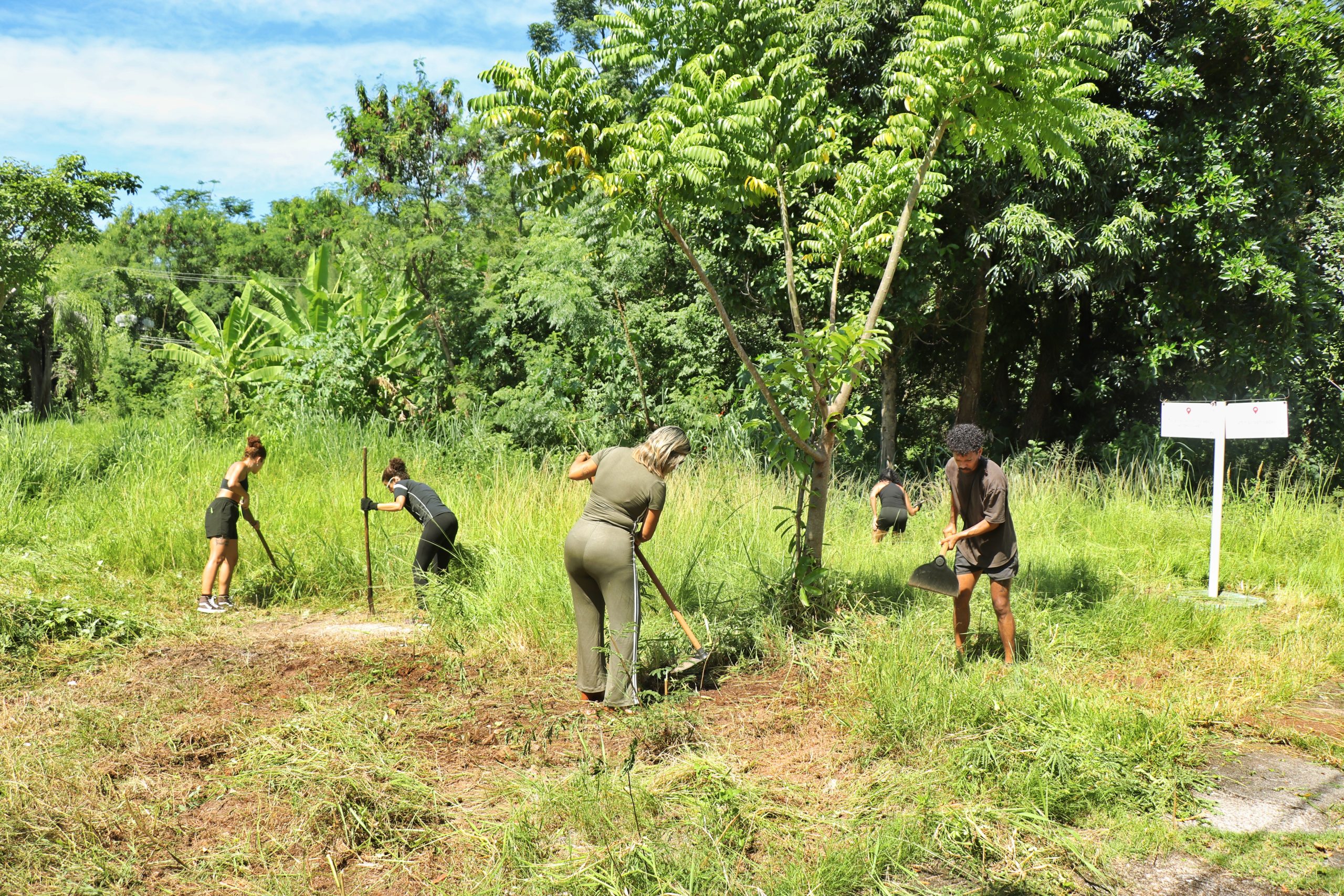 Com enxadas e facões em mãos, as participantes iniciaram o corte do mato mais resistente para abrir caminho em trechos onde o acesso ainda era difícil. Força, repetição e precisão eram as habilidades presentes na capina, no revolvimento do solo e na remoção manual de todo o material orgânico. Aos poucos, o que antes era um campo tomado pelo mato, que encobria as placas do Museu, começava a revelar o chão de terra e a se tornar novamente um espaço de memória utilizável.