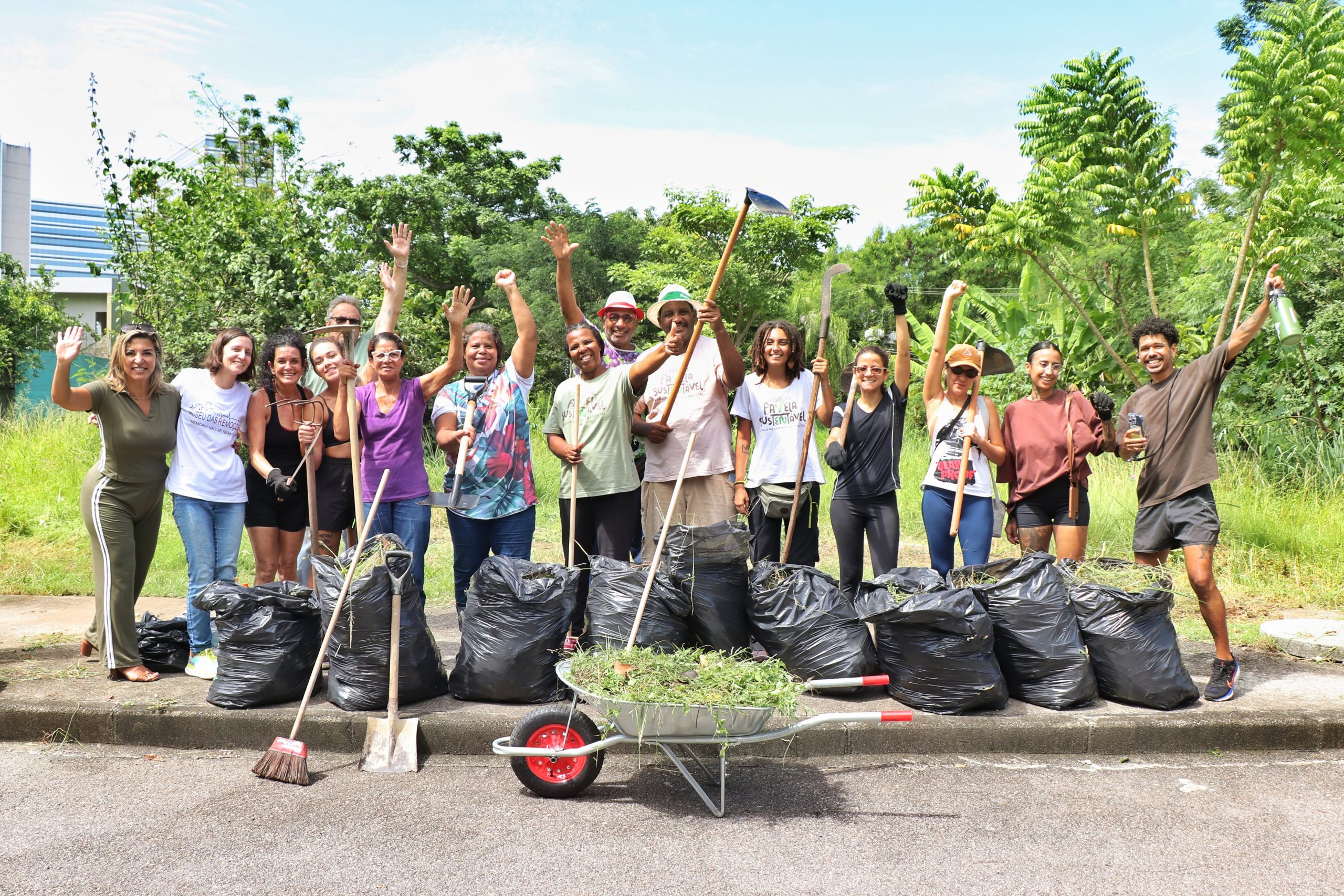 Na manhã de sábado, dia 11 de abril, uma ação coletiva de cuidado—tradição de longa data—em uma área verde da comunidade evidenciou a mobilização em prol do local e do Museu das Remoções. O mutirão representa o cuidado com a memória do território e se coloca como uma resposta à falta de cuidados por parte da Prefeitura. Moradores, voluntários e parceiros se reuniram para garantir, com as próprias mãos, a manutenção do percurso expositivo do Museu das Remoções. A atividade integrou a Agenda Coletiva da Rede Favela Sustentável.*