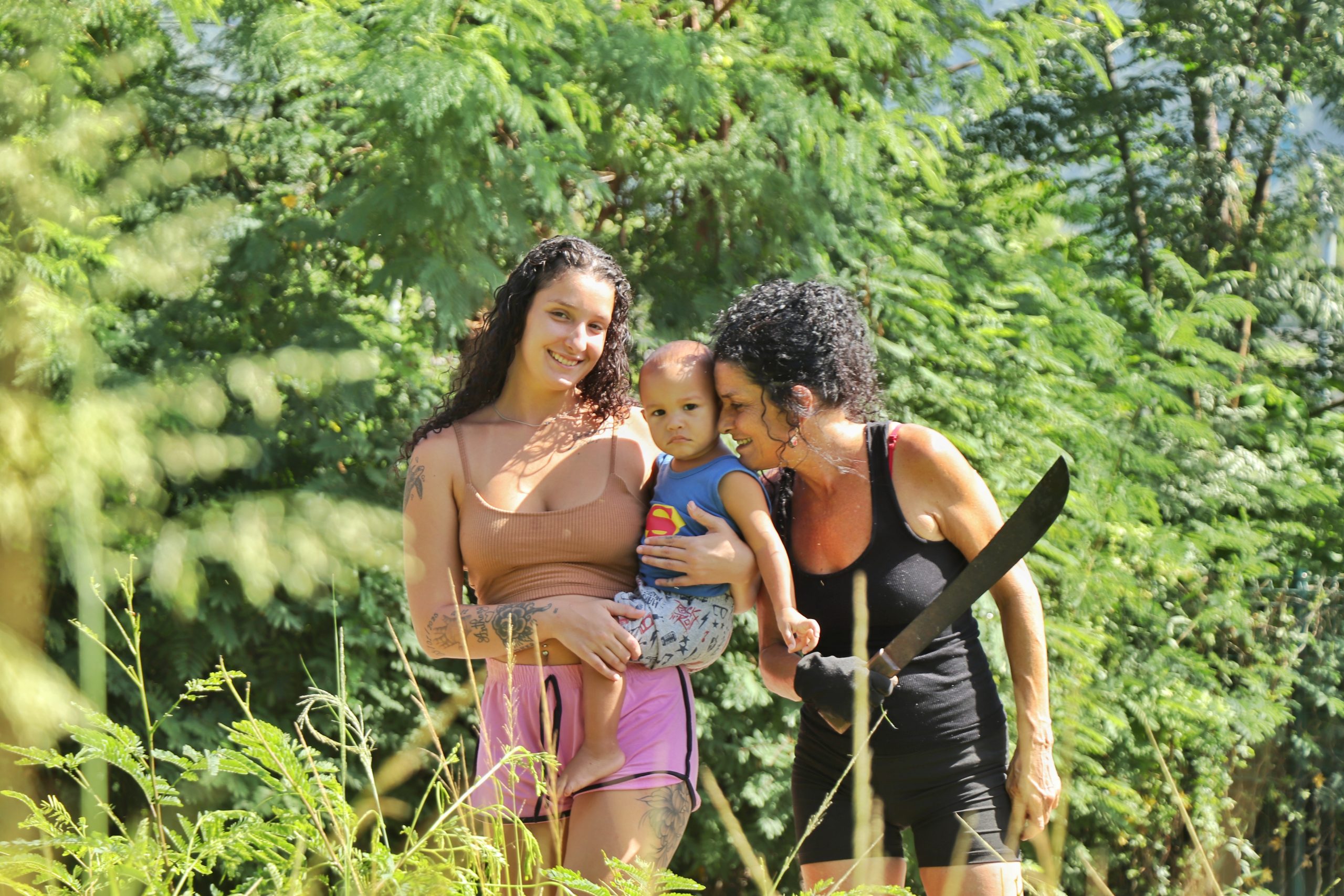 Entre memórias de luta pela permanência no território, o mutirão ganhou um significado que foi além da ação coletiva naquele sábado. Para Sandra, ações como essa conectam passado, resistência e o sentido do trabalho coletivo realizado hoje. Com três gerações de sua família capinando sob forte sol, Sandra, com seu facão na mão, conta:
